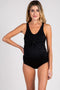 A solid hued maternity tankini top featuring a triangle faux wrap bust, ruched sides, and adjustable/convertible straps that cross in the back. All swimwear sold as separates.