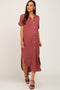 A solid maternity maxi dress featuring functioning front buttons, a collar, two front pockets, cuffed short dolman sleeves, and a hi-low rounded hemline.