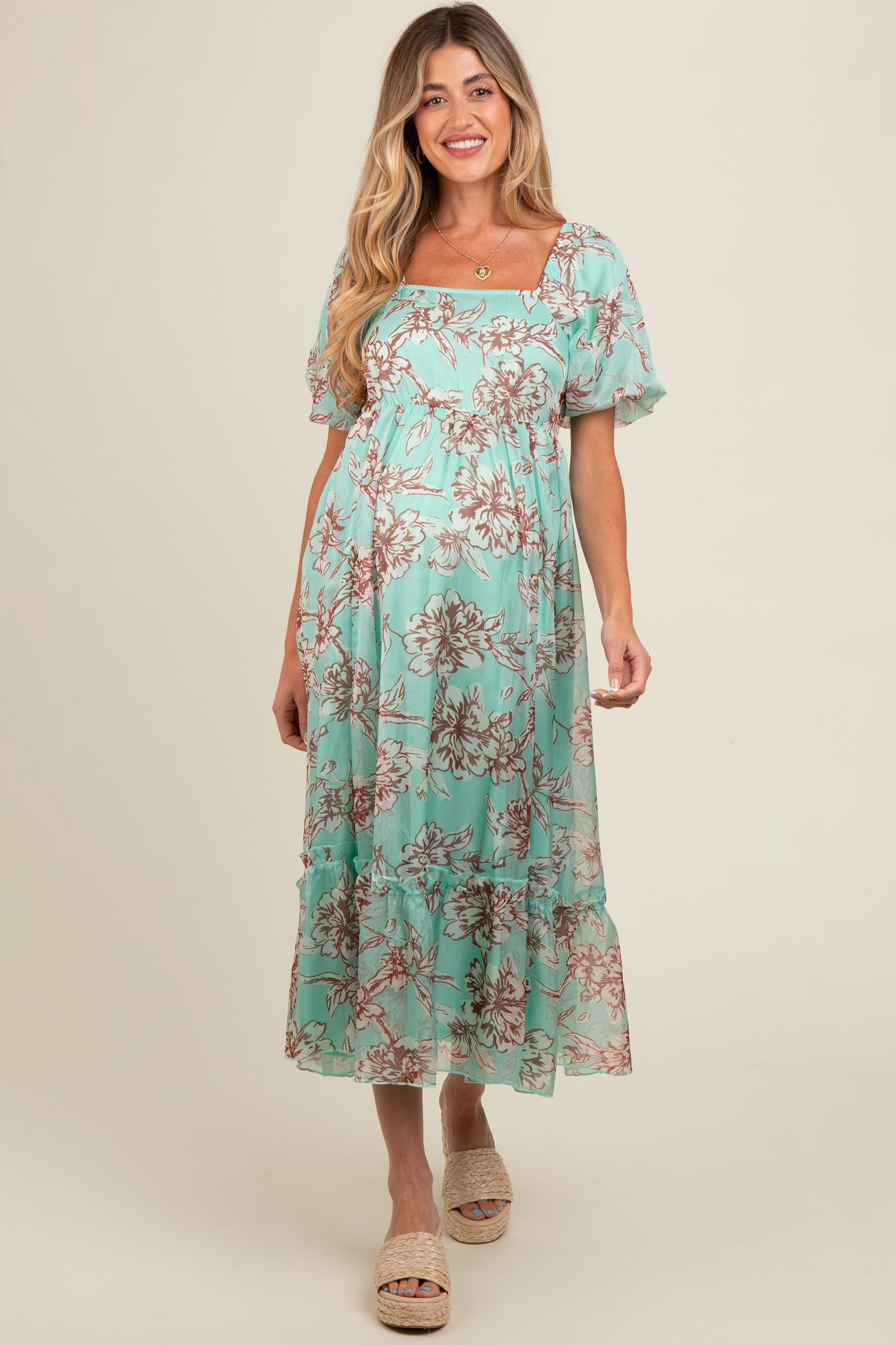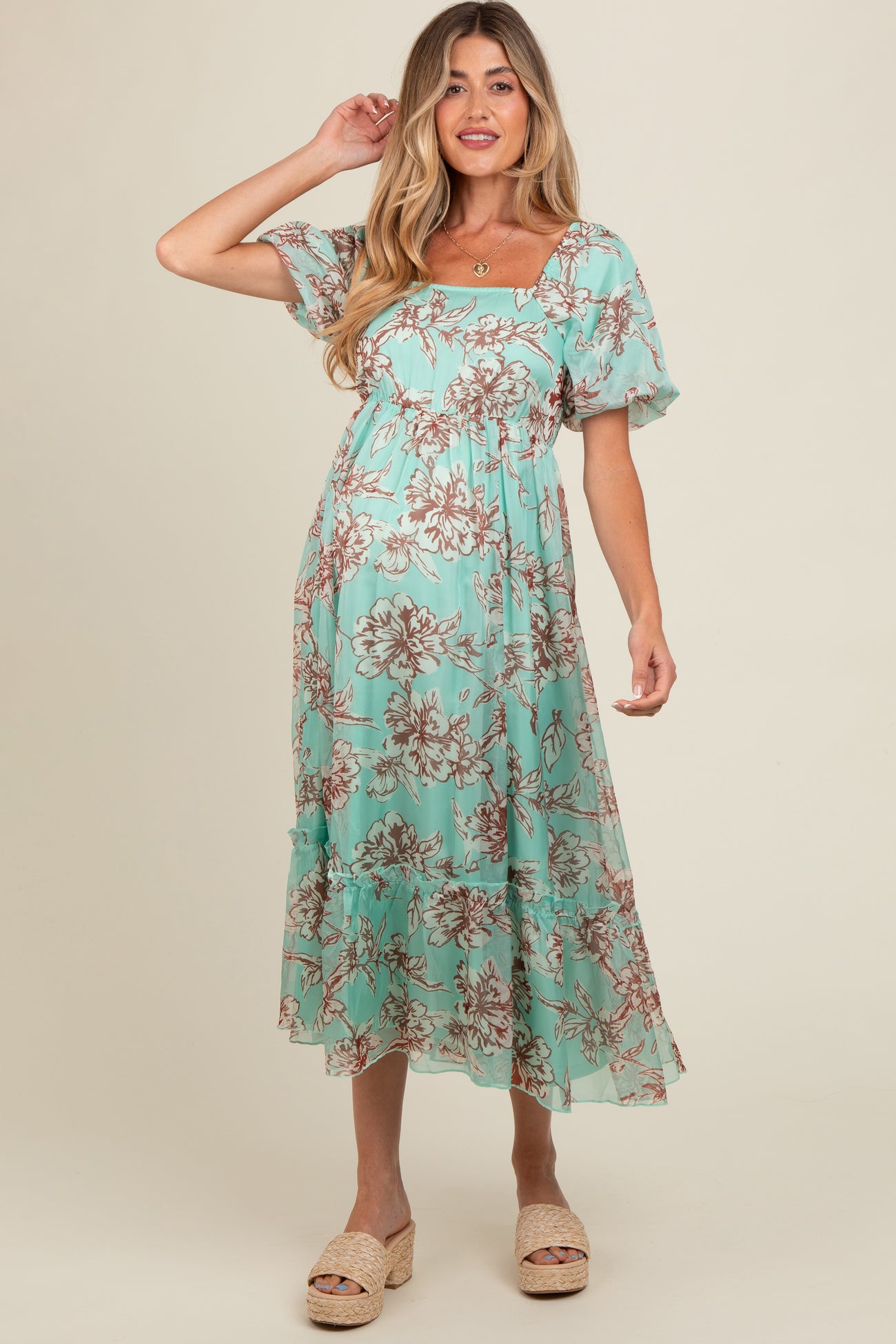 Mint Green Floral Chiffon Ruffle Hem Maternity Midi Dress