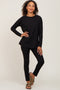 An open knit maternity sweater featuring top front functioning buttons, a ribbed rounded neckline, and long raglan sleeves.