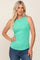 A basic solid tank top in a ribbed material with a higher neckline and rounded hem.