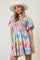 A multi color printed dress featuring a smocked top, short puff sleeves, side pockets and a square neckline.