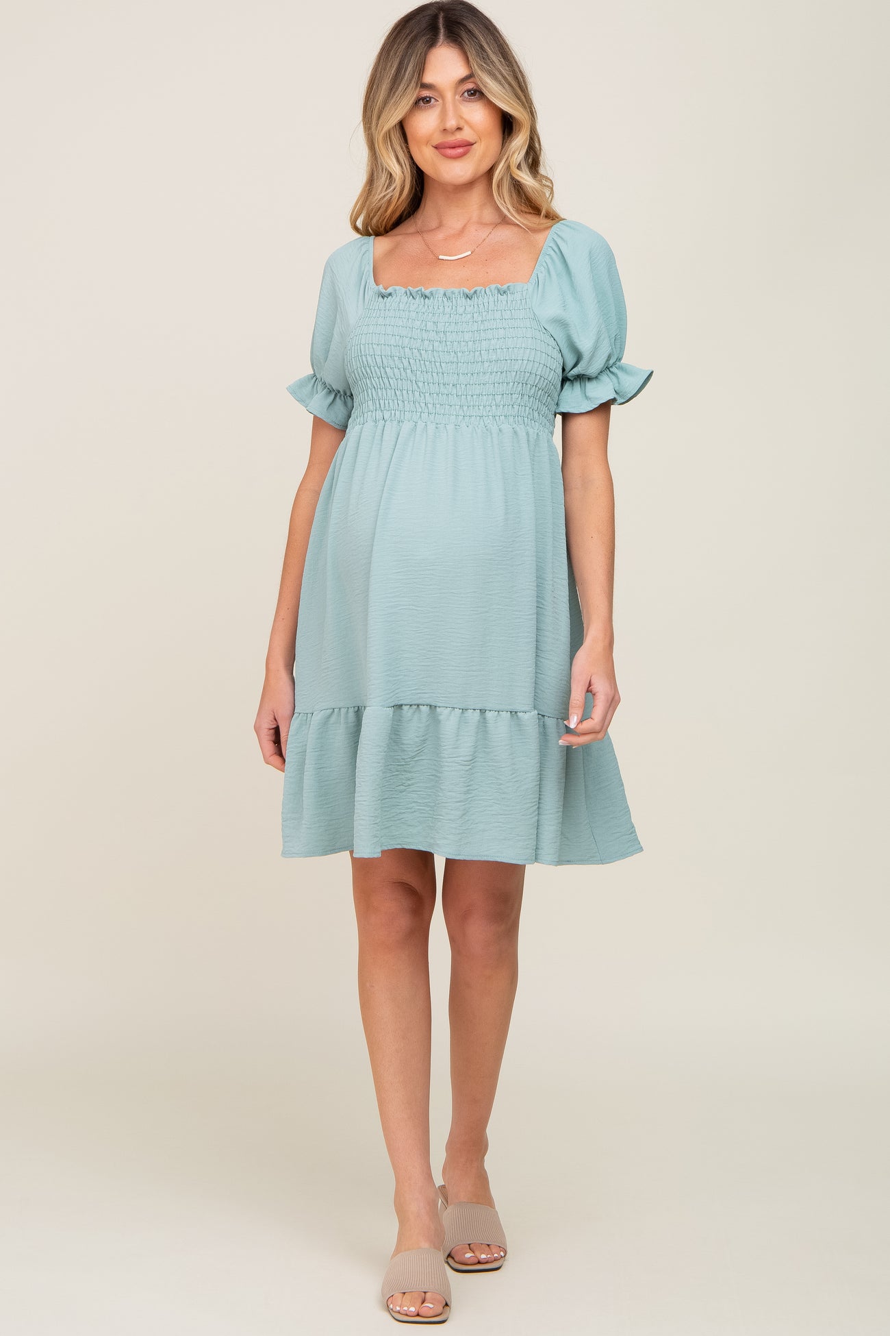 A smocked bust dress with a square neckline, puff sleeves, and ruffle trim accents.