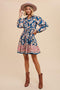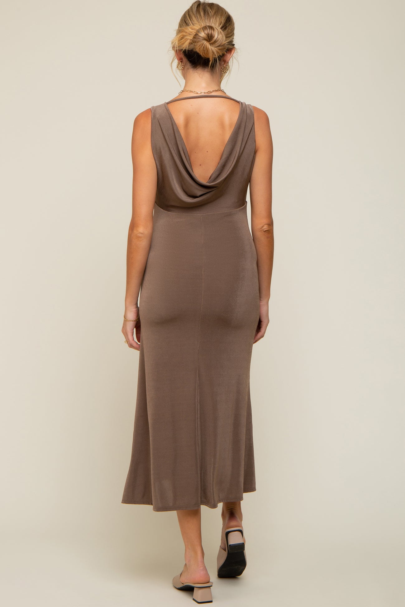 A maternity midi dress featuring a v-neckline, a draped back, and an a-line skirt. Dress is lined 3/4 of the way down.
