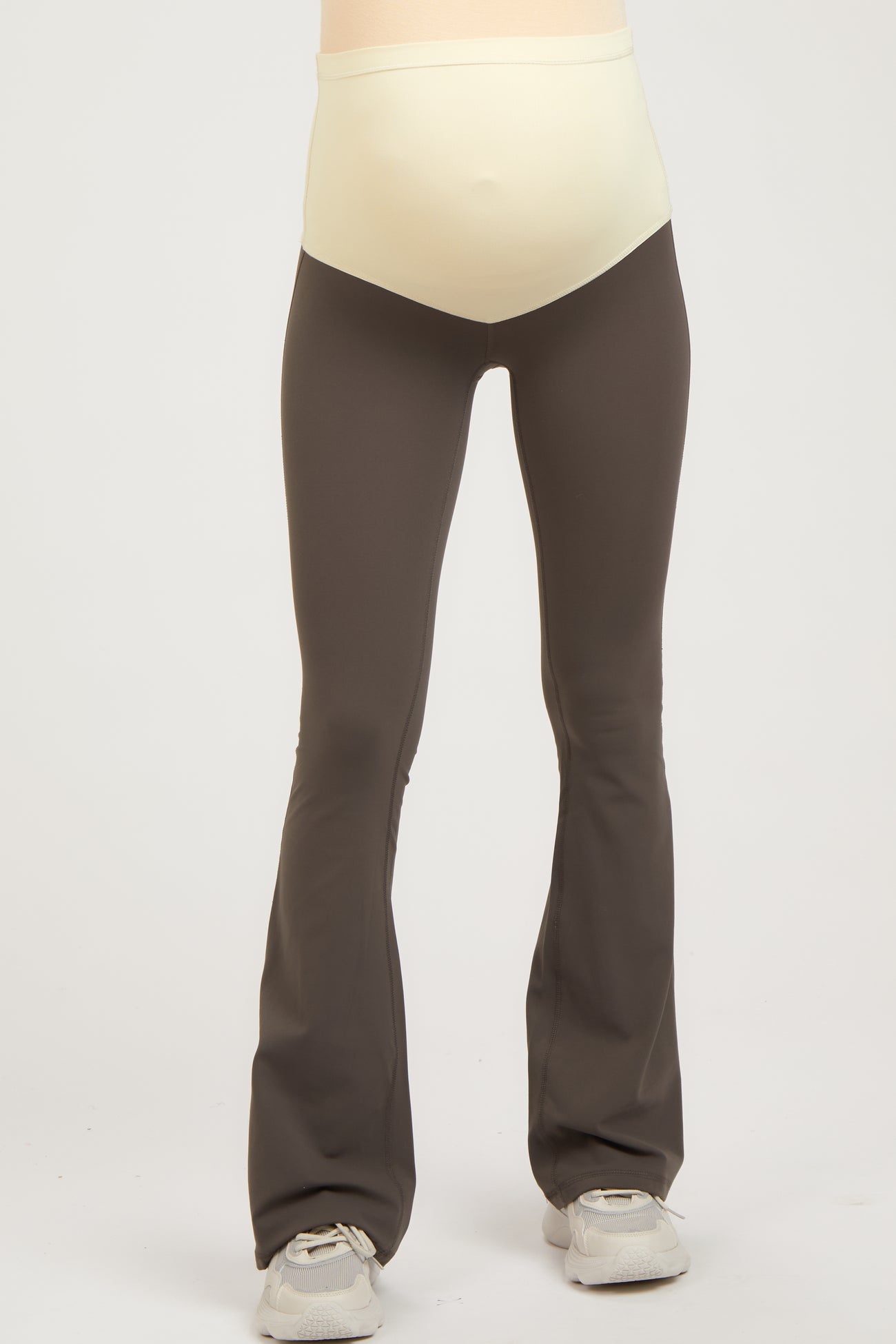 A pair of active maternity pants featuring an elastic belly band and flared pant legs.