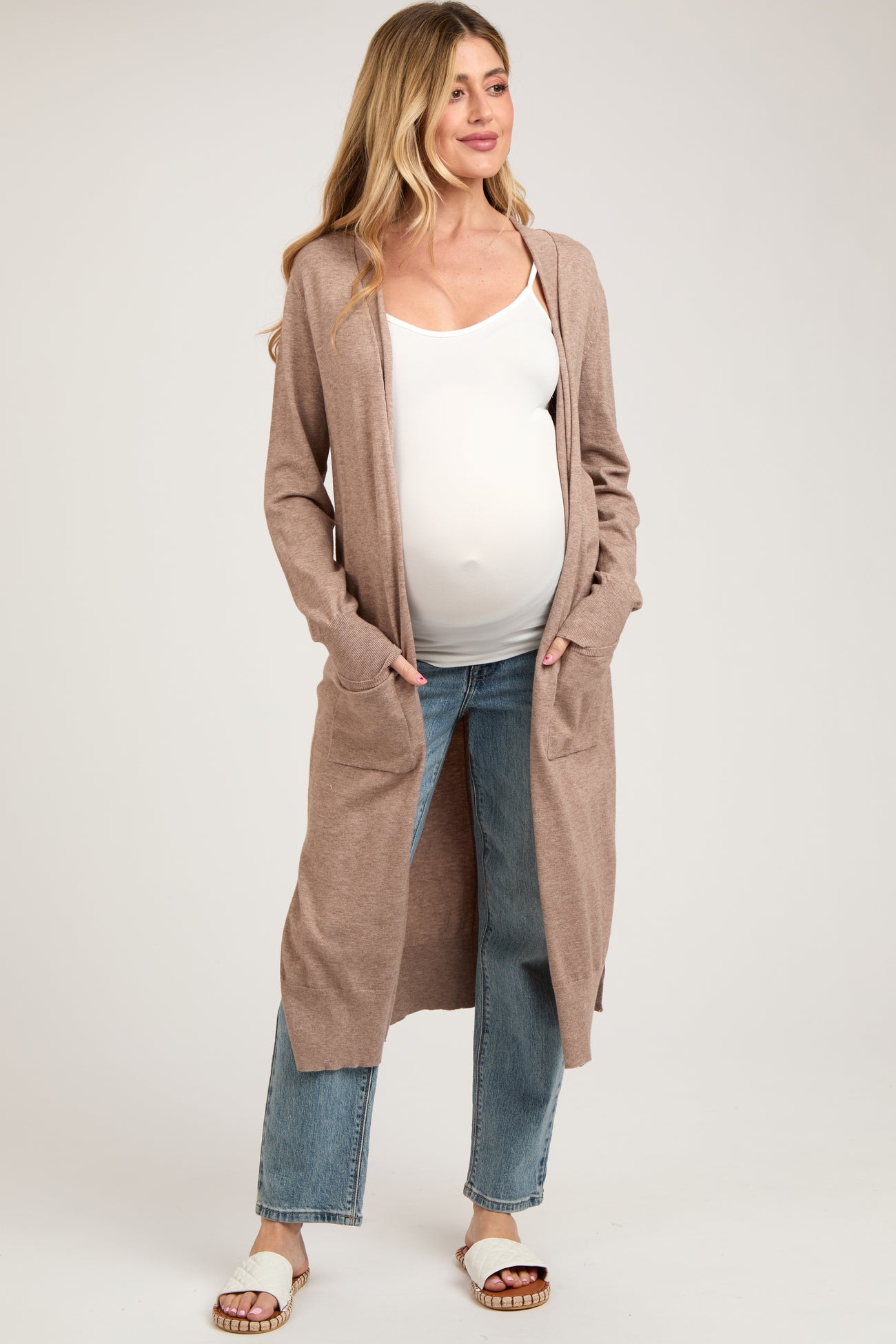 A solid hued long maternity cardigan featuring long sleeves, side pockets and an open front.