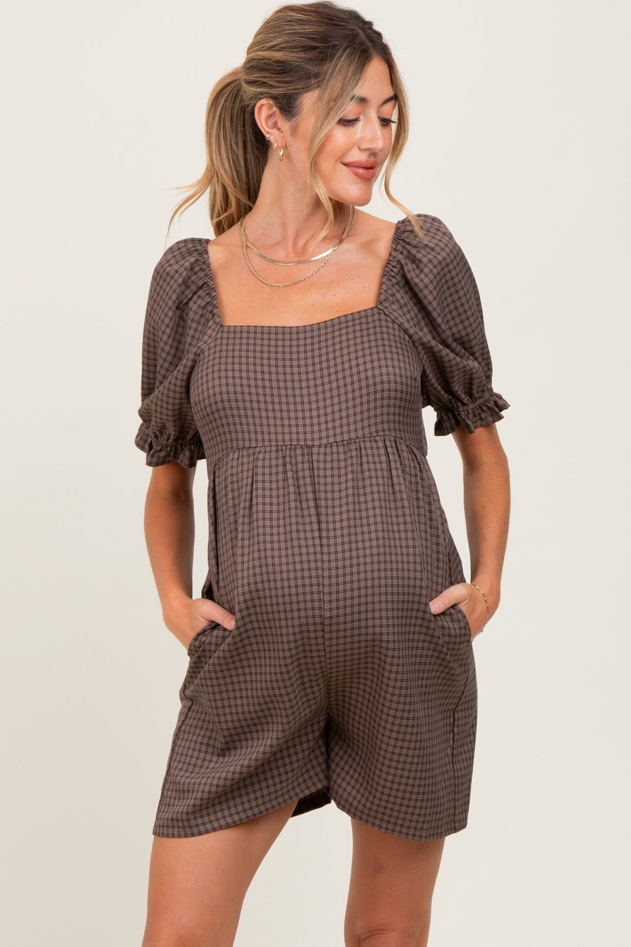 Mocha Plaid Square Neck Puff Sleeve Maternity Romper