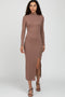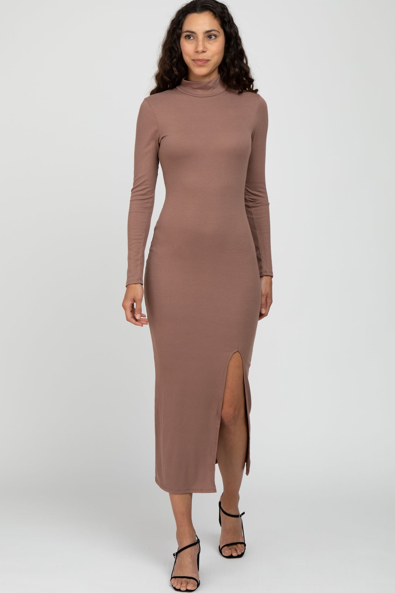 Mocha Ribbed Mock Neck Side Slit Maternity Maxi Dress