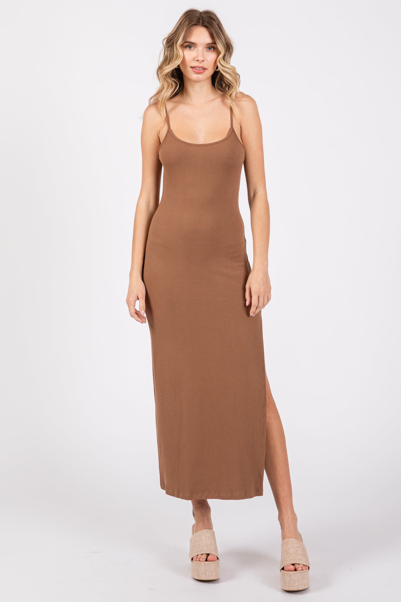 Mocha Ribbed Sleeveless Side Slit Maternity Dress