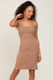 A solid hued ribbed sleeveless maternity dress. Rounded neckline.