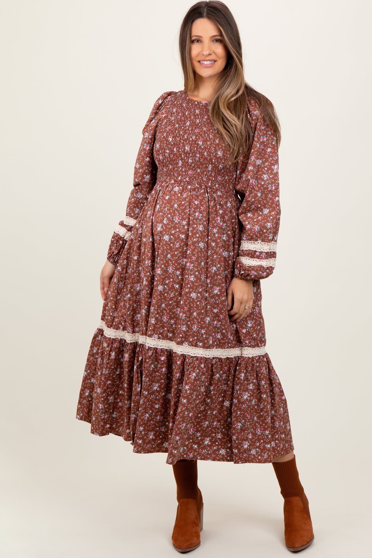 Mocha Smocked Floral Crochet Lace Trim Maternity Maxi Dress