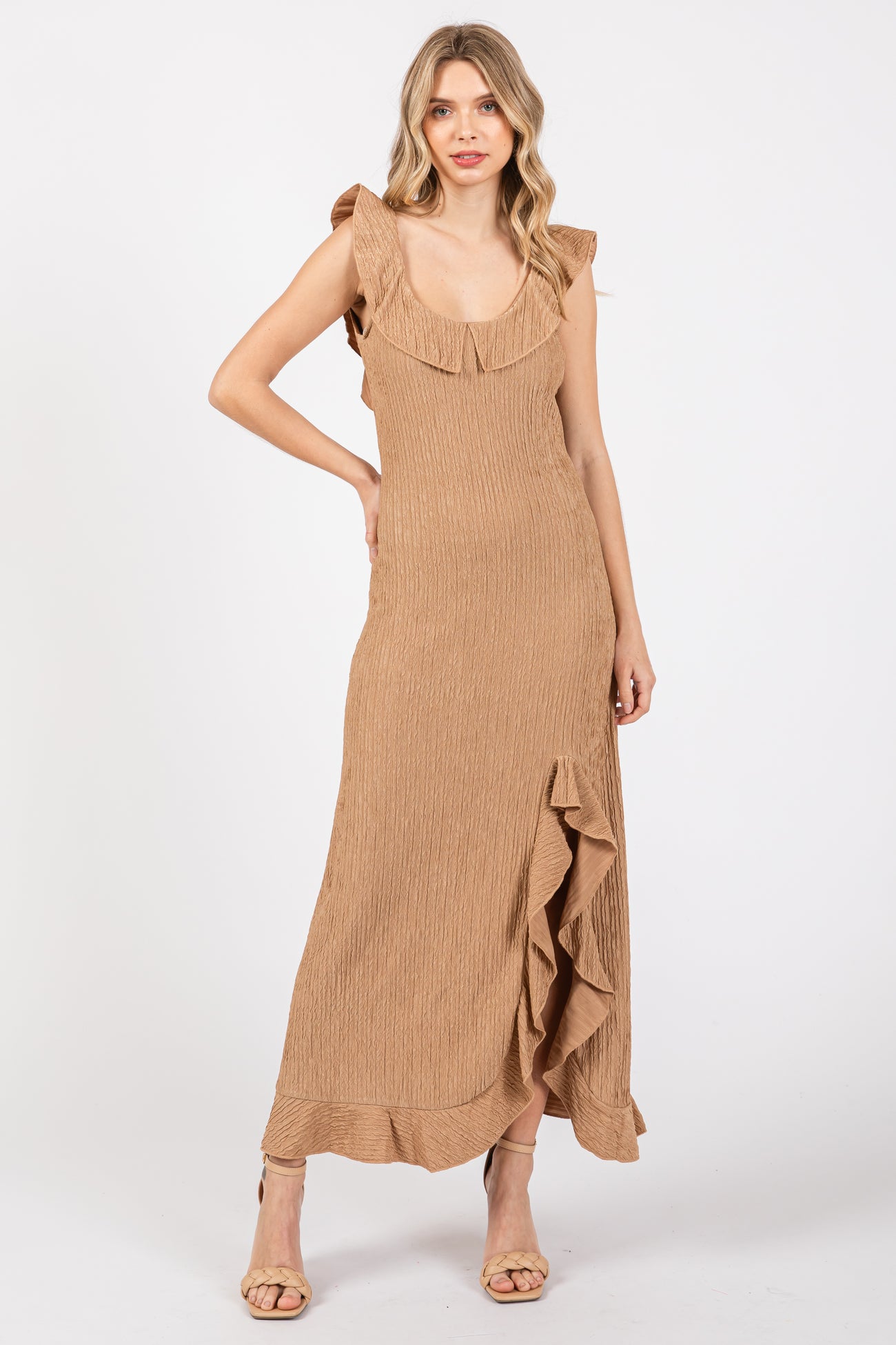 Mocha Textured Sleeveless Ruffle Slit Maternity Maxi Dress