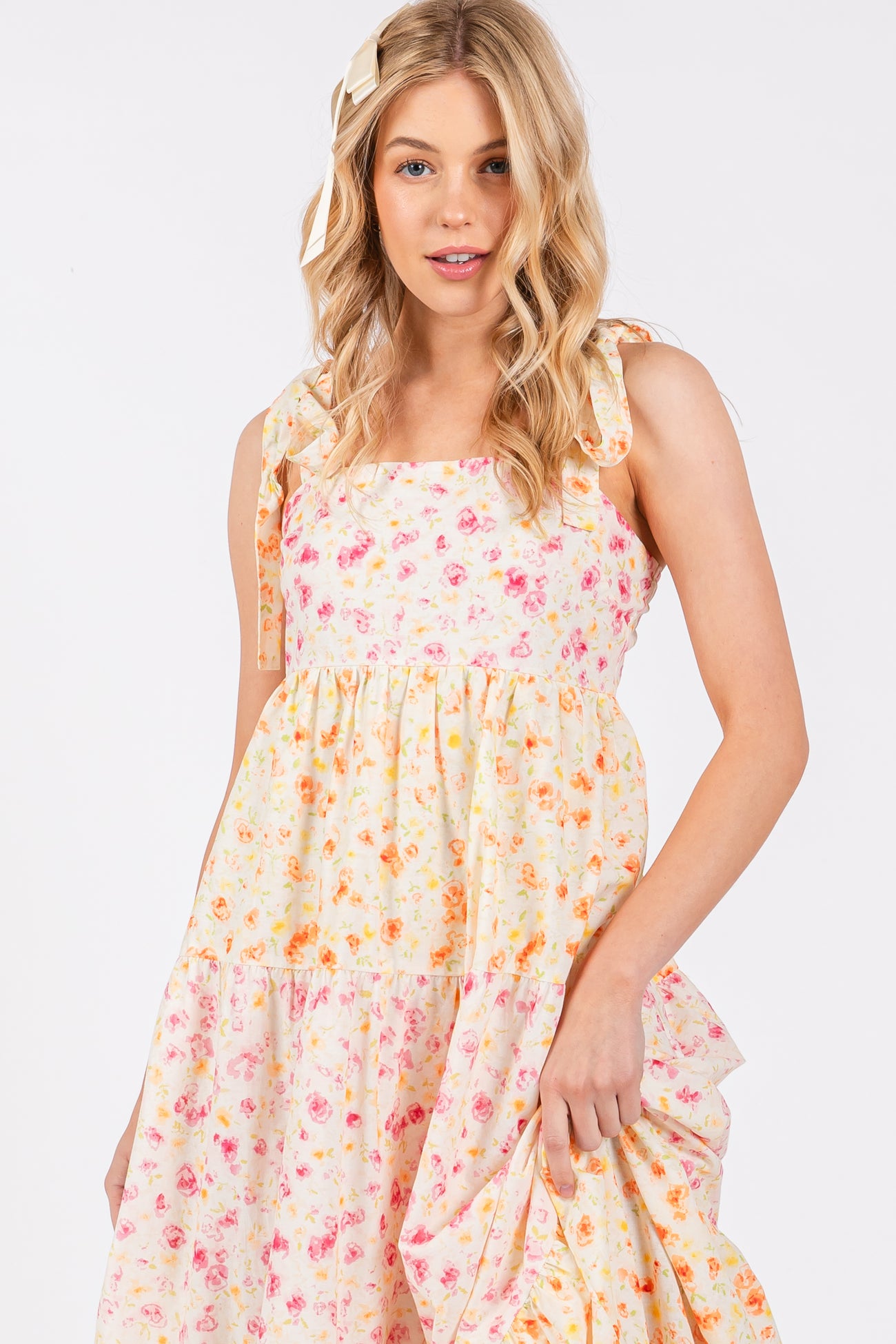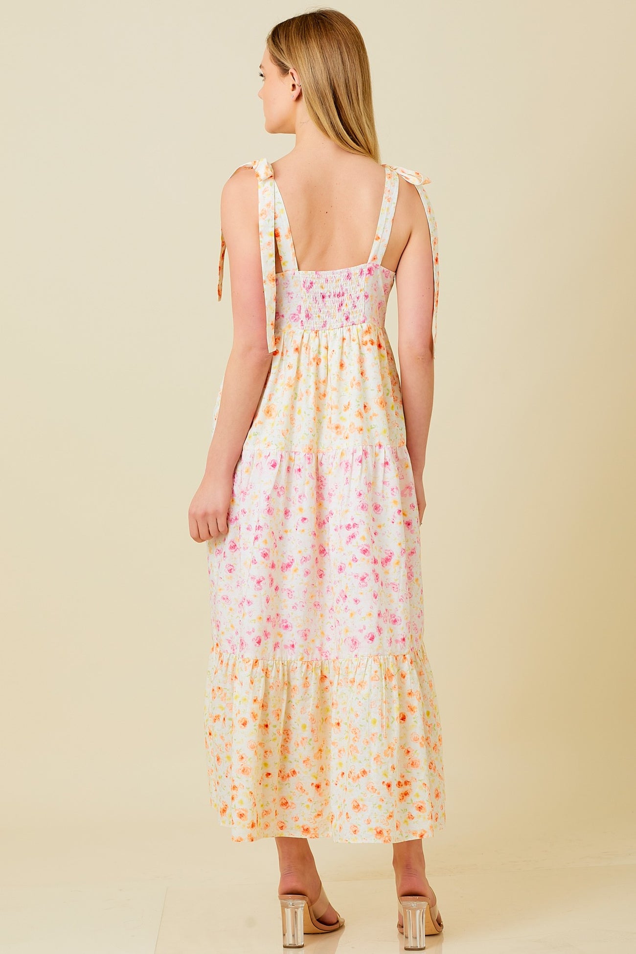Multi-Color Floral Square Neck Shoulder Tie Tiered Midi Dress