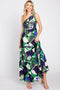 A floral midi dress. Features a halter tie, a cinched top, a smocked back, and a waist tie. Skirt is partially lined.