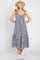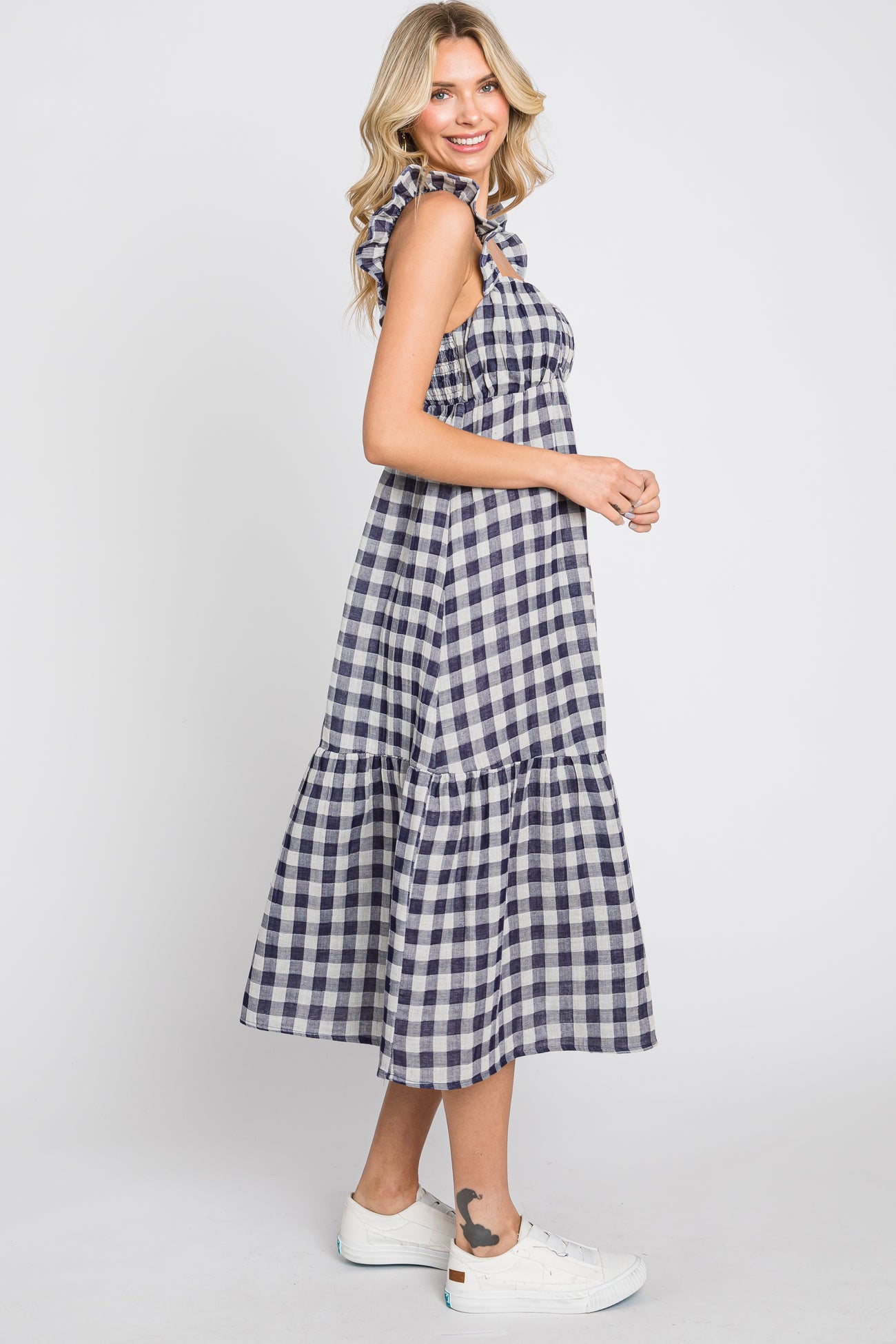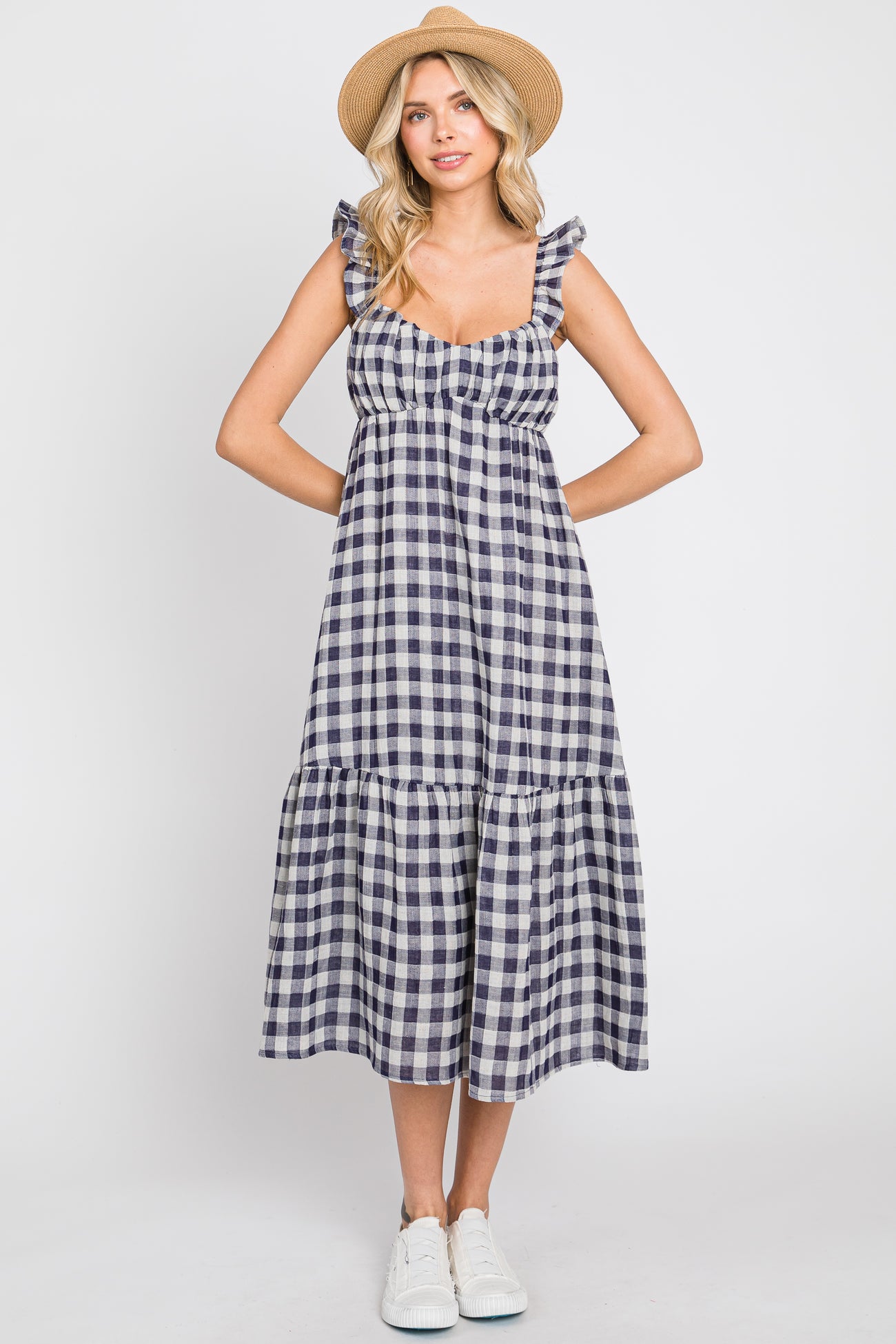 Navy Blue Checkered Linen Sweetheart Neck Ruffle Strap Midi Dress
