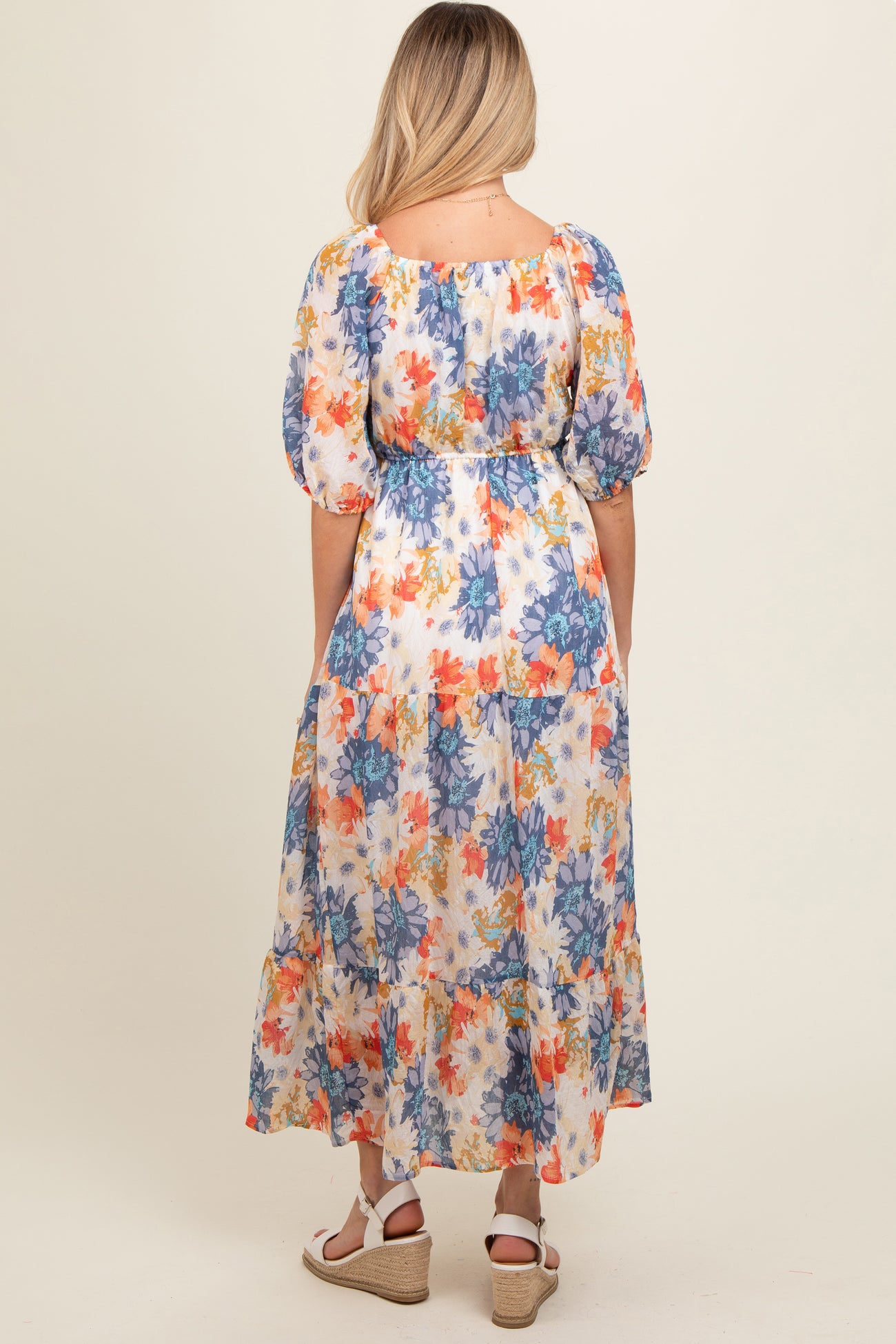Navy Blue V-Neck Short Puff Sleeve Tiered Maternity Midi Dress