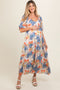 Navy Blue V-Neck Short Puff Sleeve Tiered Midi Dress