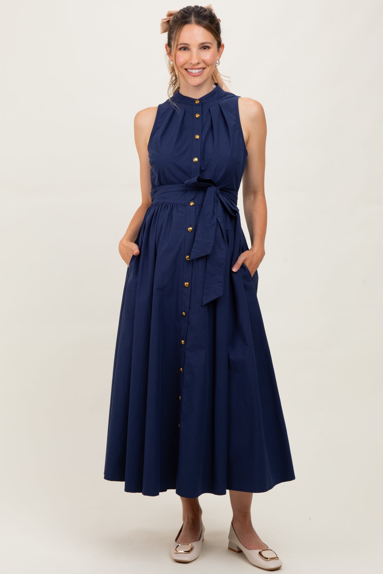 Navy Button Down Sleeveless Maternity Shirt Dress