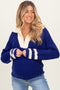 Stay cozy and stylish with our Navy Colorblock Chunky Knit Half Zip Sweater. Featuring a bold navy base with crisp cream accents on the collar and sleeve stripes, this sweater offers a modern twist on classic knitwear. The chunky texture and half-zip design provide warmth and versatility, making it perfect for layering during cooler days. Pair it effortlessly with your favorite jeans or casual pants for a chic, relaxed look. Crafted for comfort and style, this sweater is a must-have for your fall and winter wardrobe. Easy to wear, easy to love!