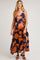 A floral print maternity midi dress featuring ruched thick elastic straps, a v-neckline and side slits.