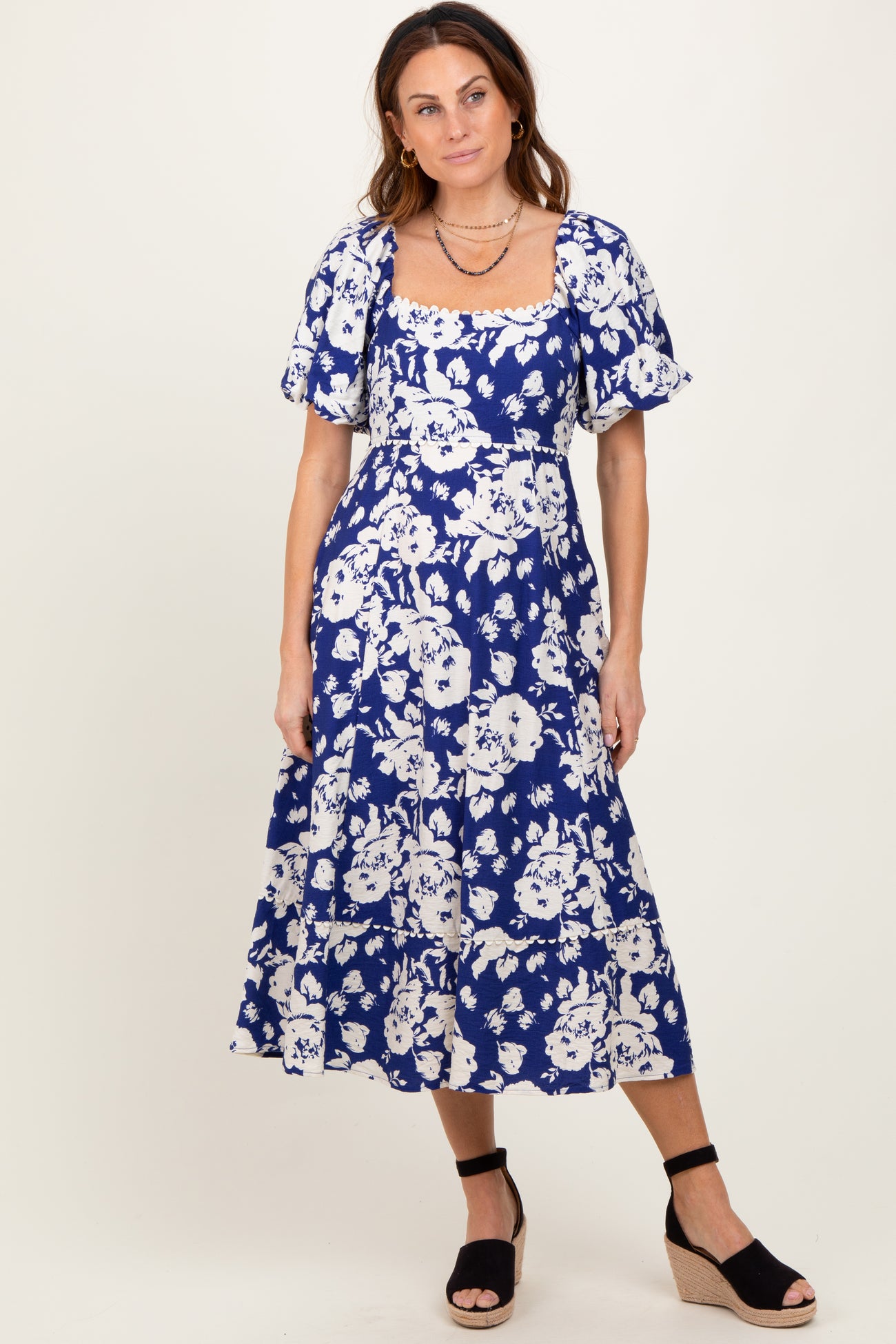 Navy Floral Scallop Trim Puff Sleeve Midi Dress