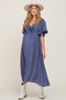 A solid hued midi dress featuring a v-neckline with an adjustable front tie, a front cutout, short ruffle sleeves, a smocked elastic back, an empire waist and an A-line double lined skirt.