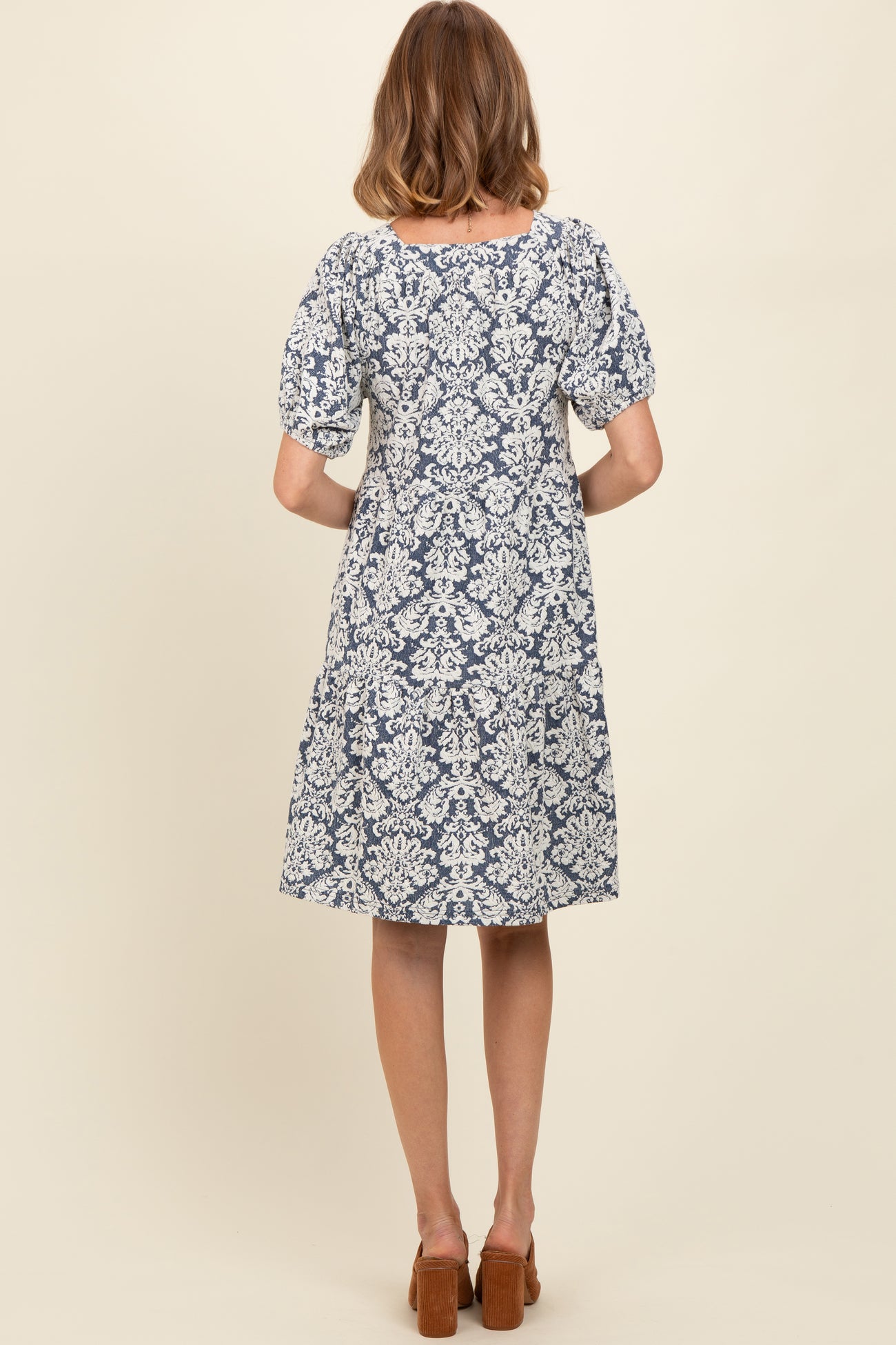 Navy Jacquard Damask Print Dress