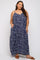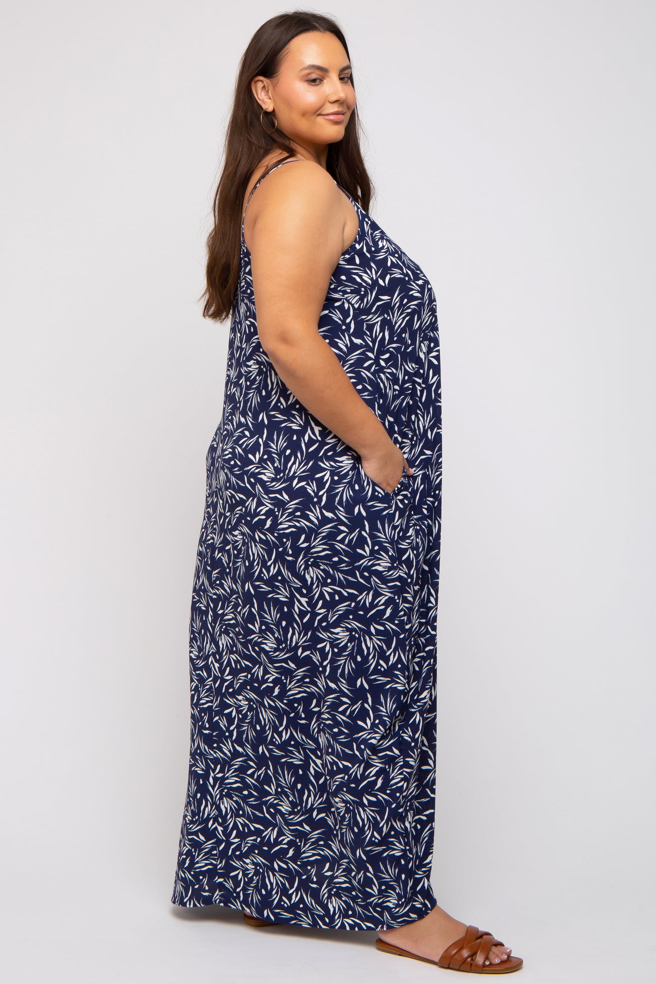 Navy Leaf Print Double V-Neck Plus Maxi Dress