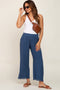 A pair of crop length, linen pants featuring an elastic waistband, side pockets, and fringe trim.