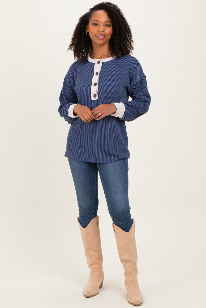 Navy Long Sleeve Contrast Button Detail Rib Top