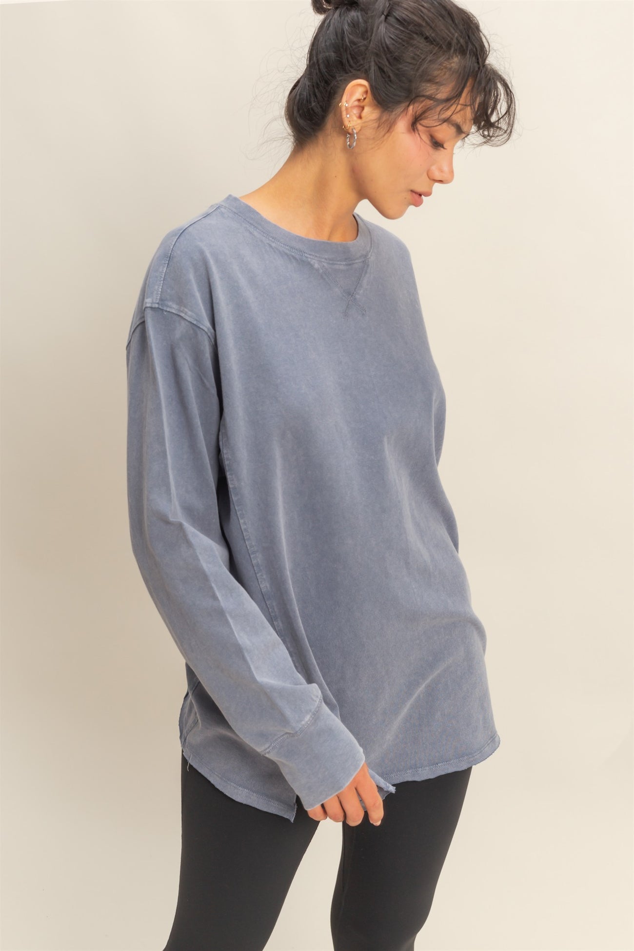 Navy Mineral Washed Drop Shoulder Long Sleeve Top