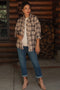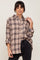 A plaid button up top with a collar, a front pocket, cuffed long sleeves, and a rounded hem.