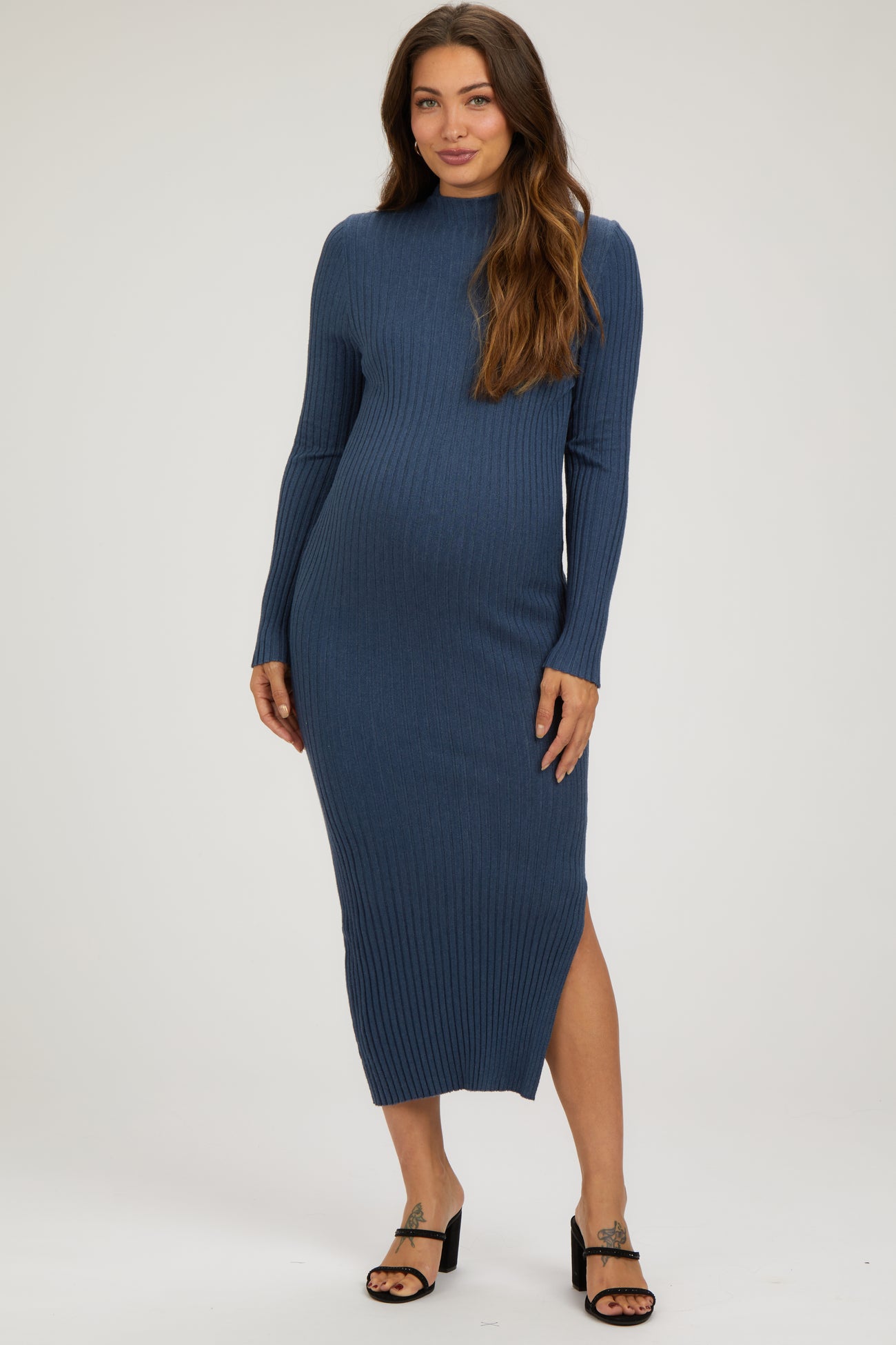 A rib knit maternity midi dress with a mock neck, long sleeves, and a side slit.