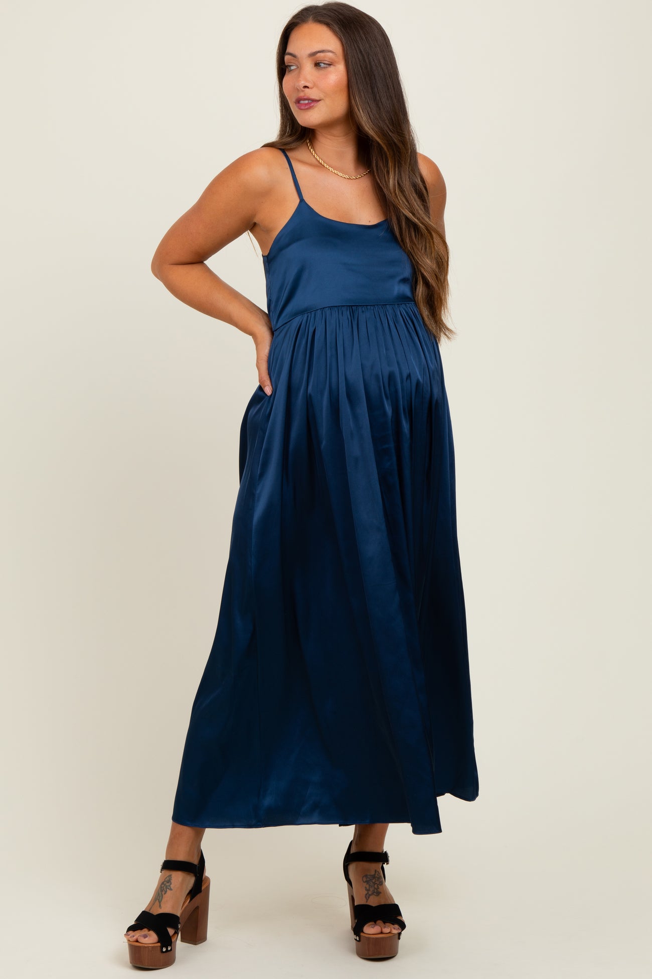 Navy Satin Sleeveless Tie-Back Maternity Midi Dress