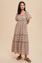 A solid hued maternity midi dress featuring short smocked sleeves, a tiered body, a ruffle hem and a v-neckline.