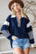 A stripe and color blocked top with a split v-neckline, a collar, exposed seams, and side slits.
