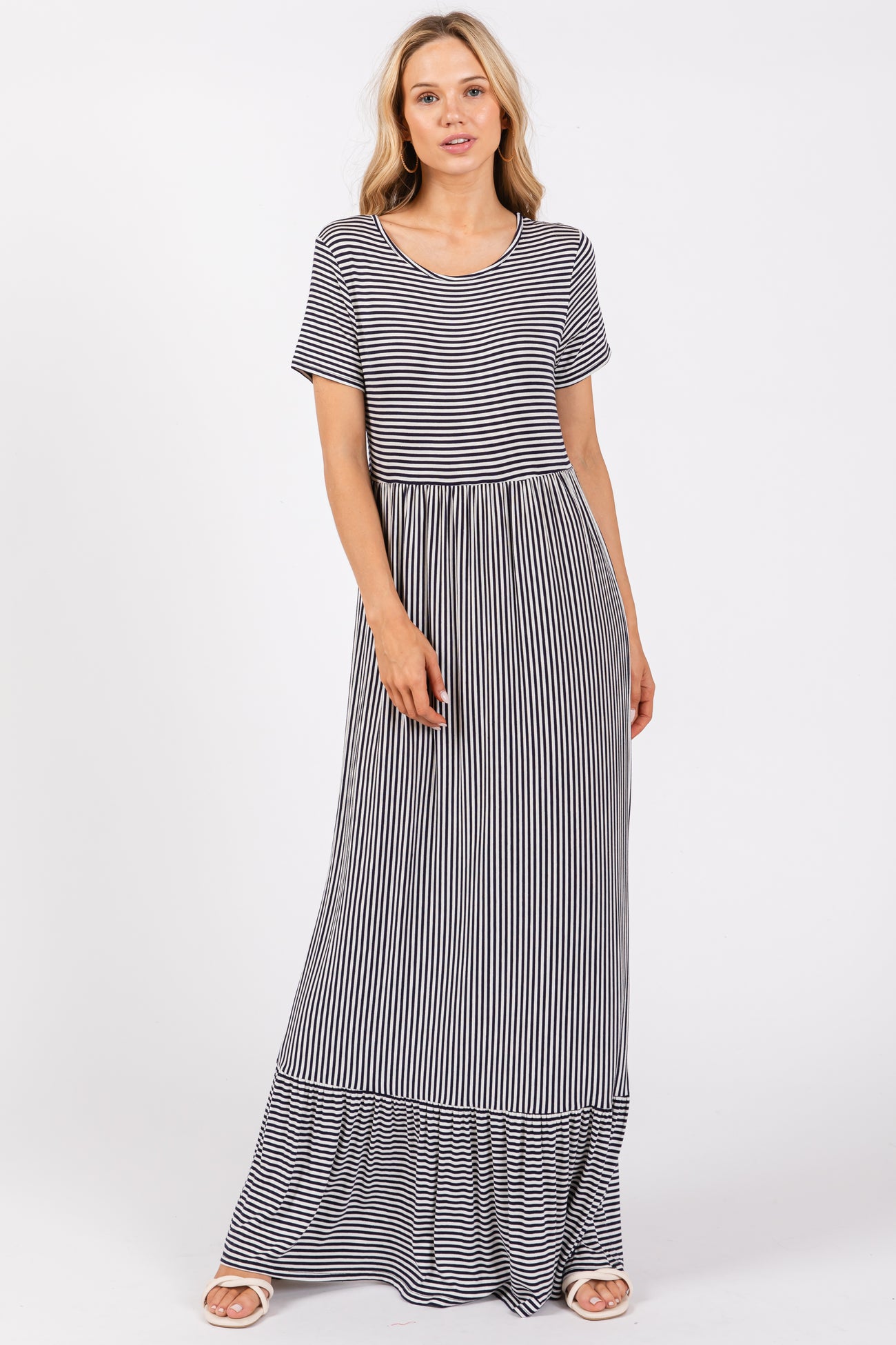 Navy Striped Short Sleeve Maternity Maxi Dress