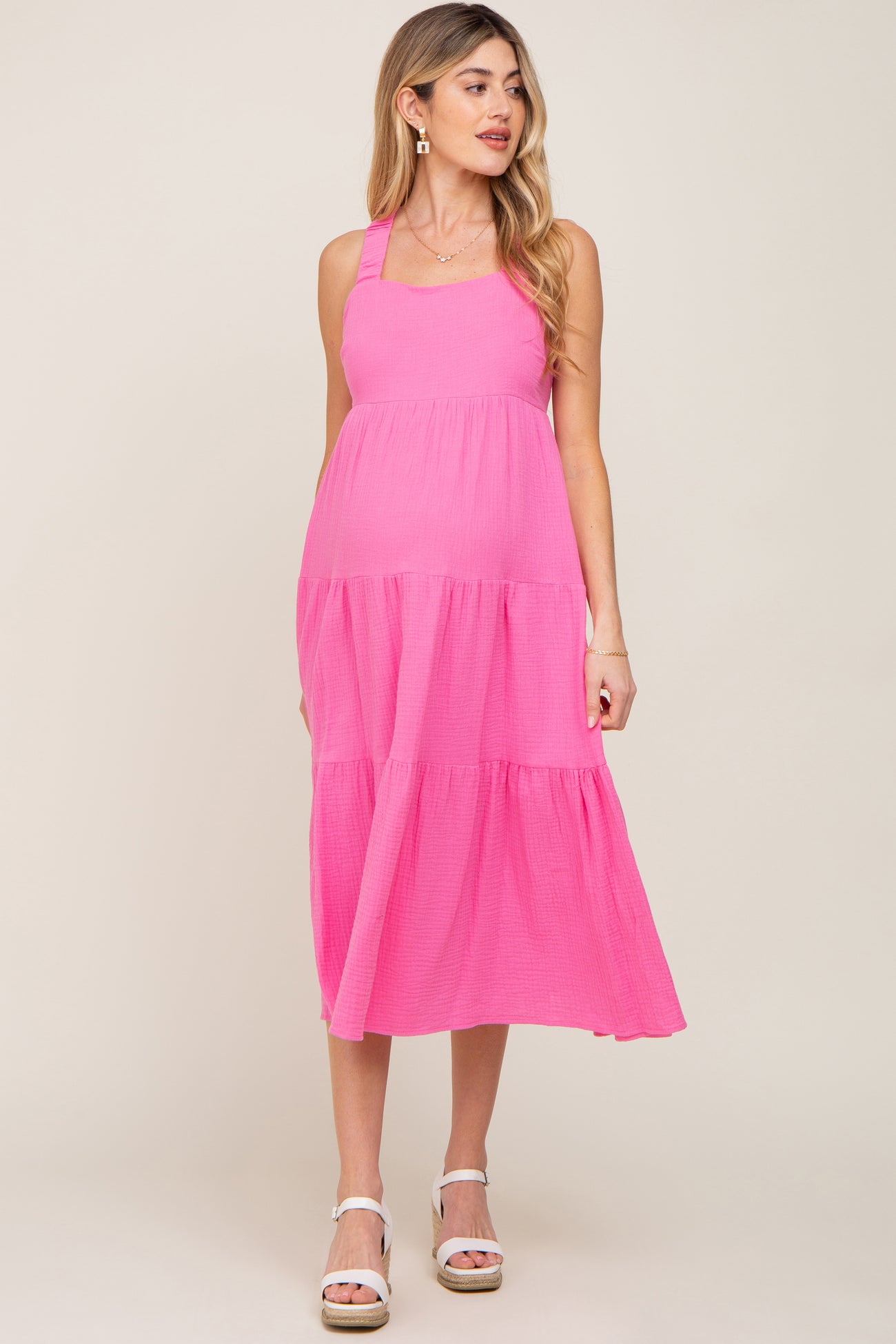 Neon Pink Tiered Crisscross Strap Maternity Midi Dress