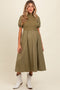 Elevate your style with our Olive Contrast Knit Bodice Midi Dress, featuring a chic combination of knit and woven fabrics. The fitted, ribbed knit bodice offers a flattering silhouette with a high neckline and puffed short sleeves that add a touch of vintage charm. The midi-length skirt flows gracefully from the waist, crafted from lightweight, breathable fabric for all-day comfort. Perfect for both casual outings and special occasions, this dress pairs effortlessly with sandals or heels. Make a statement in timeless olive green—versatile, stylish, and designed to turn heads wherever you go. Available in multiple sizes.
