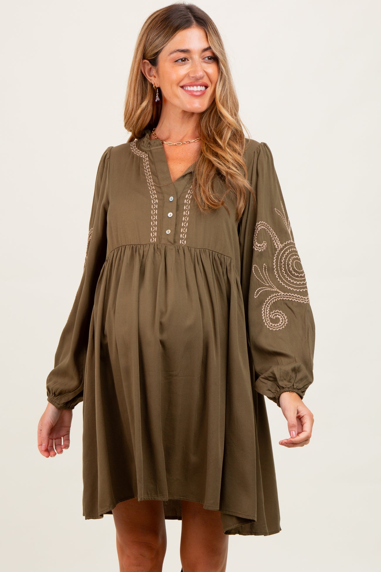 Olive Embroidered V-Neck Long Sleeve Maternity Dress