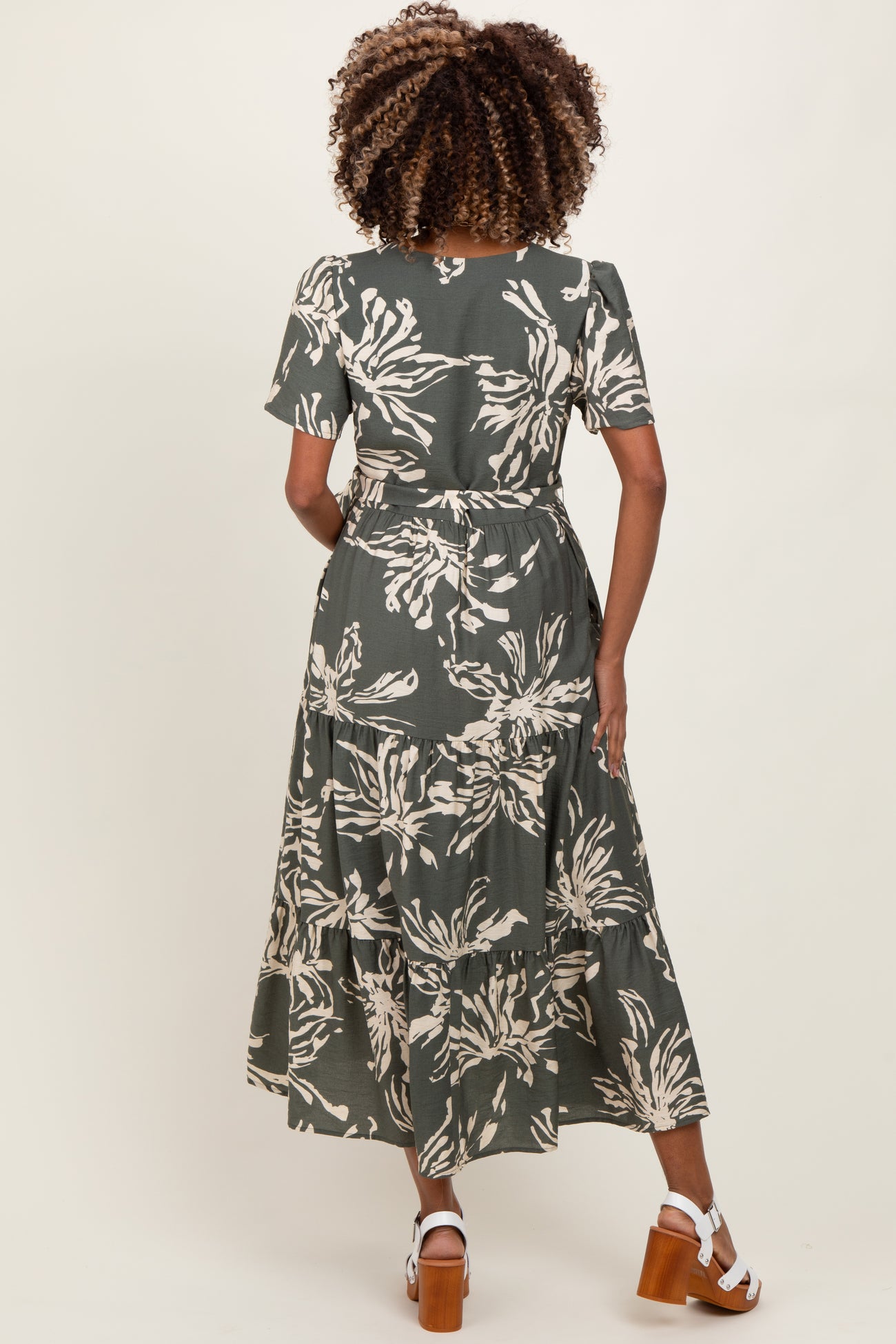 Olive Floral V-Neck Waist Tie Maternity Midi Dress
