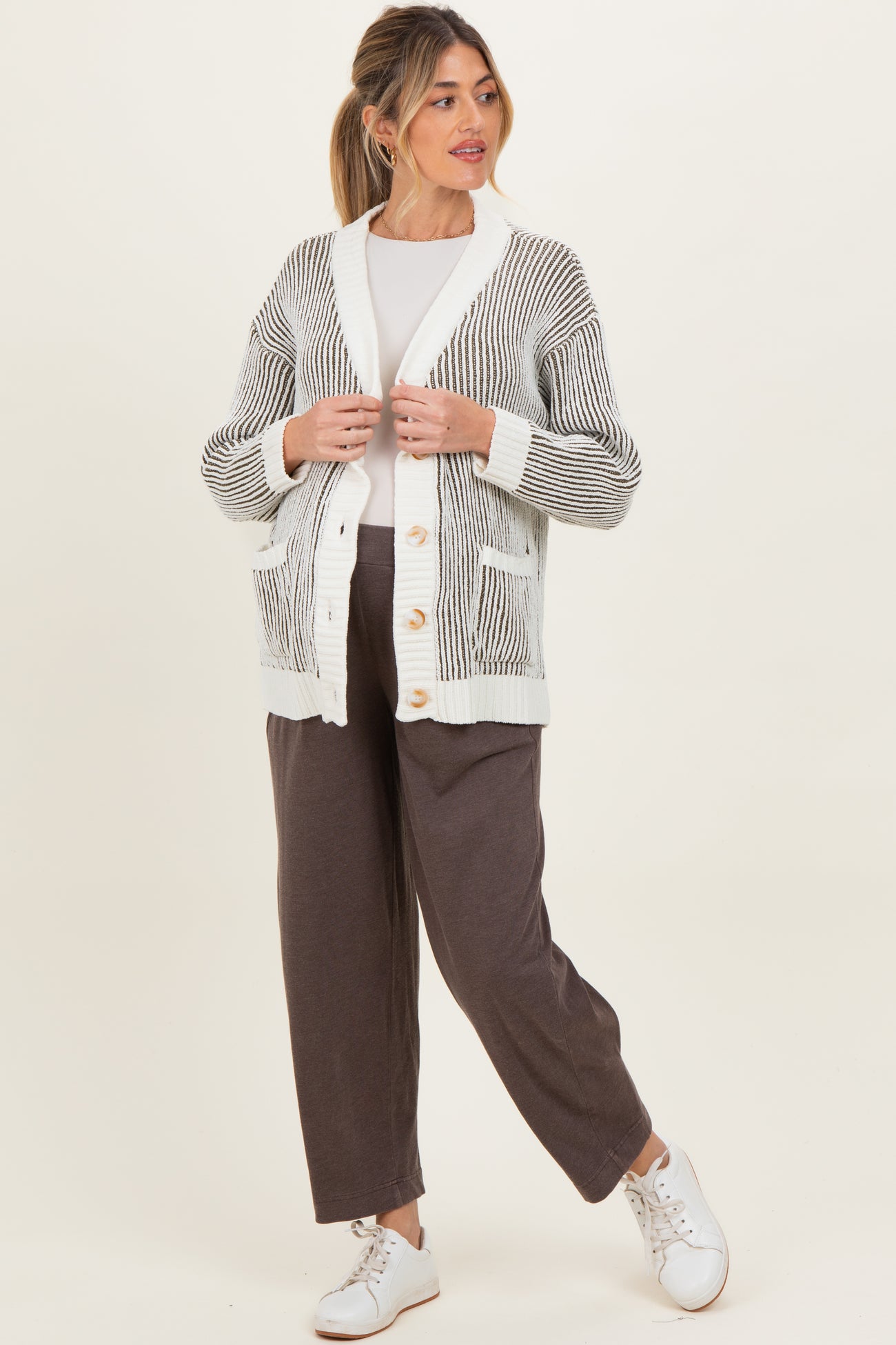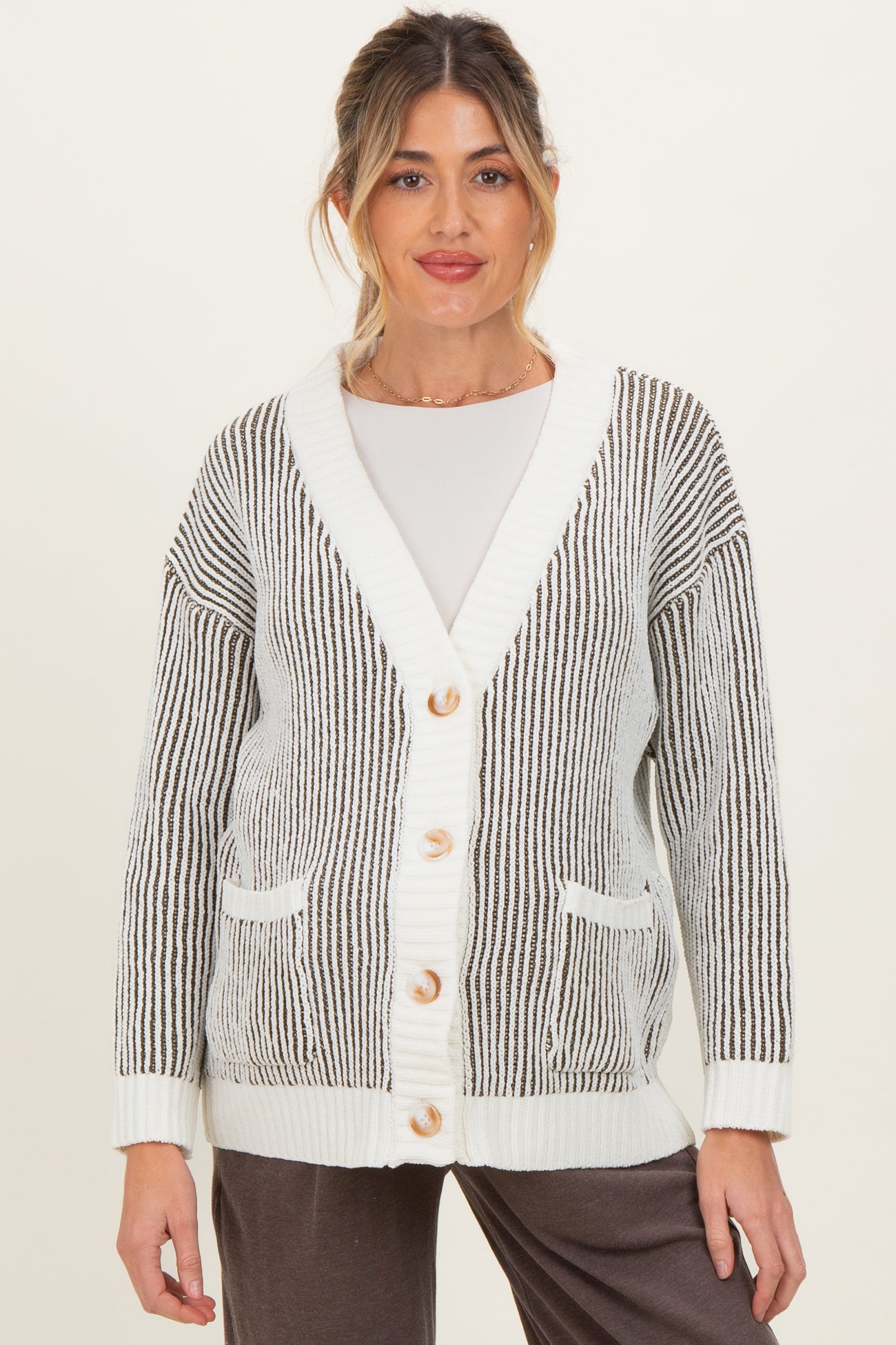 Stay cozy and stylish throughout your pregnancy with our Olive Pocketed Button Front Maternity Cardigan. Crafted from a soft knit fabric, this cardigan features an elegant olive stripe pattern on a creamy white base that complements any maternity wardrobe. The relaxed fit and front button closure make it easy to layer over your favorite tops, while the convenient front pockets add a practical touch. Designed with comfort in mind, this cardigan gently accommodates your growing bump without sacrificing style. Perfect for casual days or cozy nights, it’s a versatile essential for every mom-to-be. Machine washable for easy care.
