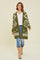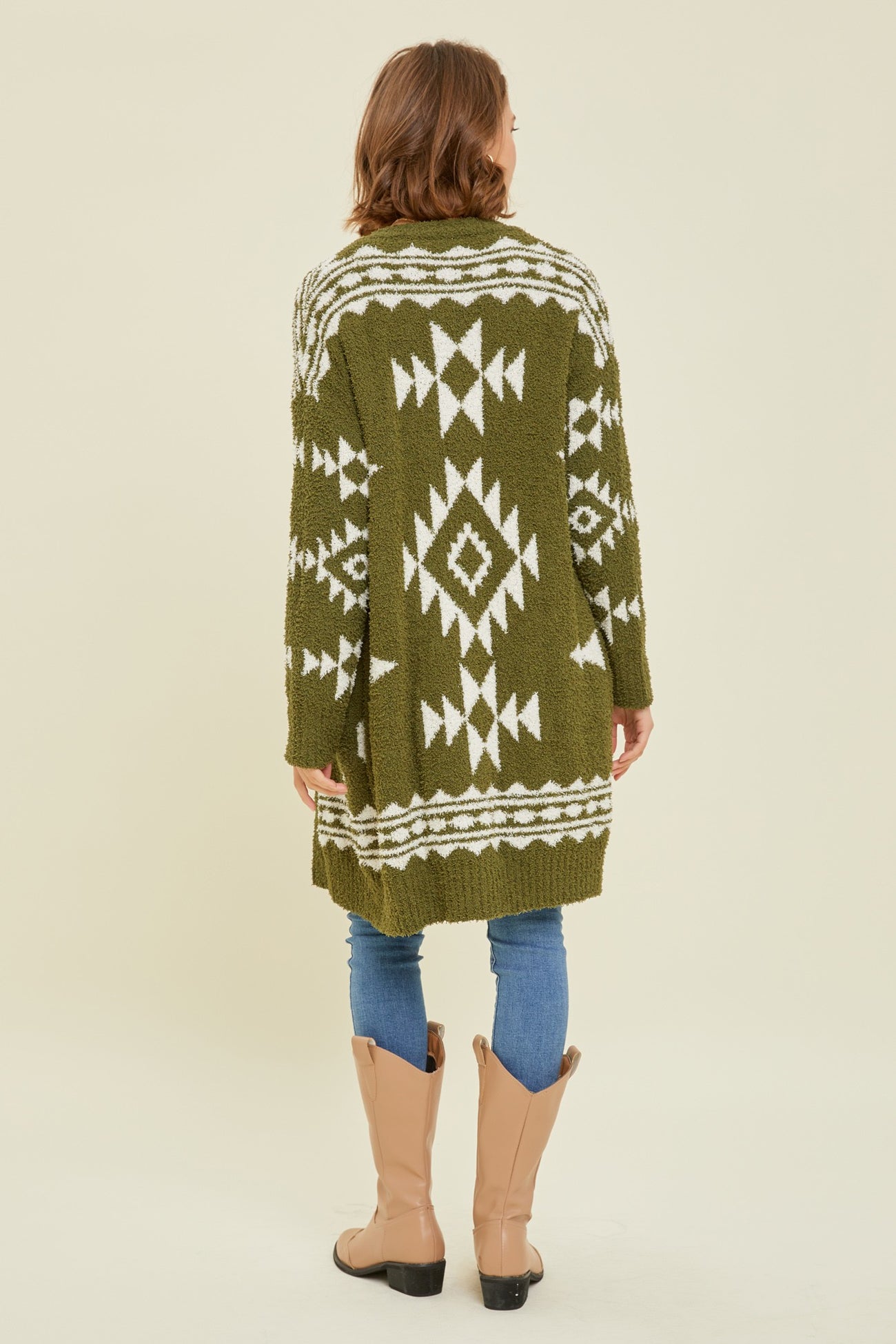 A printed open front cardigan in a fuzzy knit material with two side pockets.