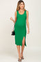 A sleeveless, ribbed maternity midi dress featuring a scoop neckline, side slit, a back cutout, and back tie.