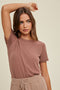 A solid ribbed maternity top featuring short sleeves, a curved hem and a rounded neckline.