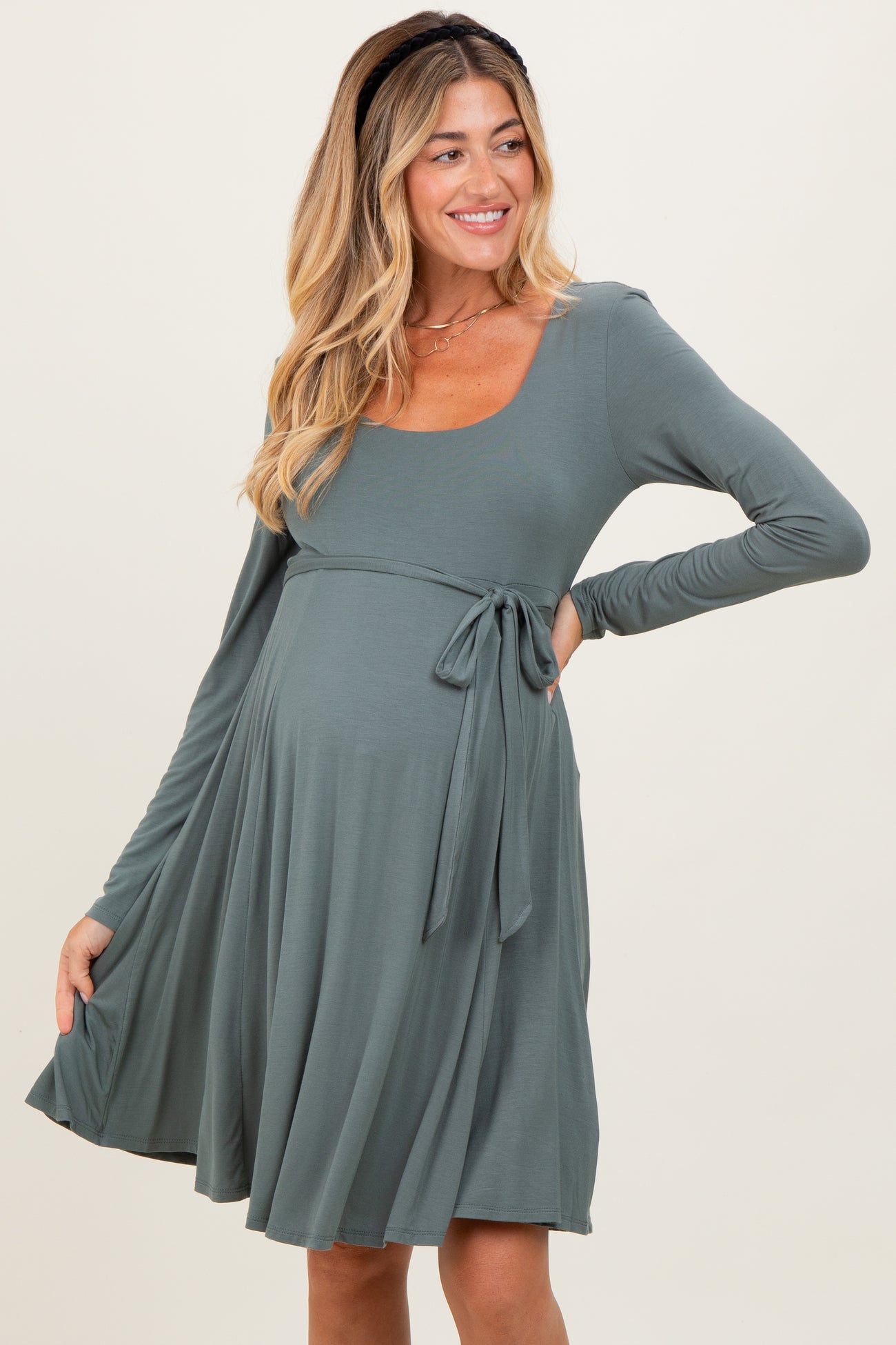 Olive Scoop Neck Long Sleeve Waist Tie Maternity Dress