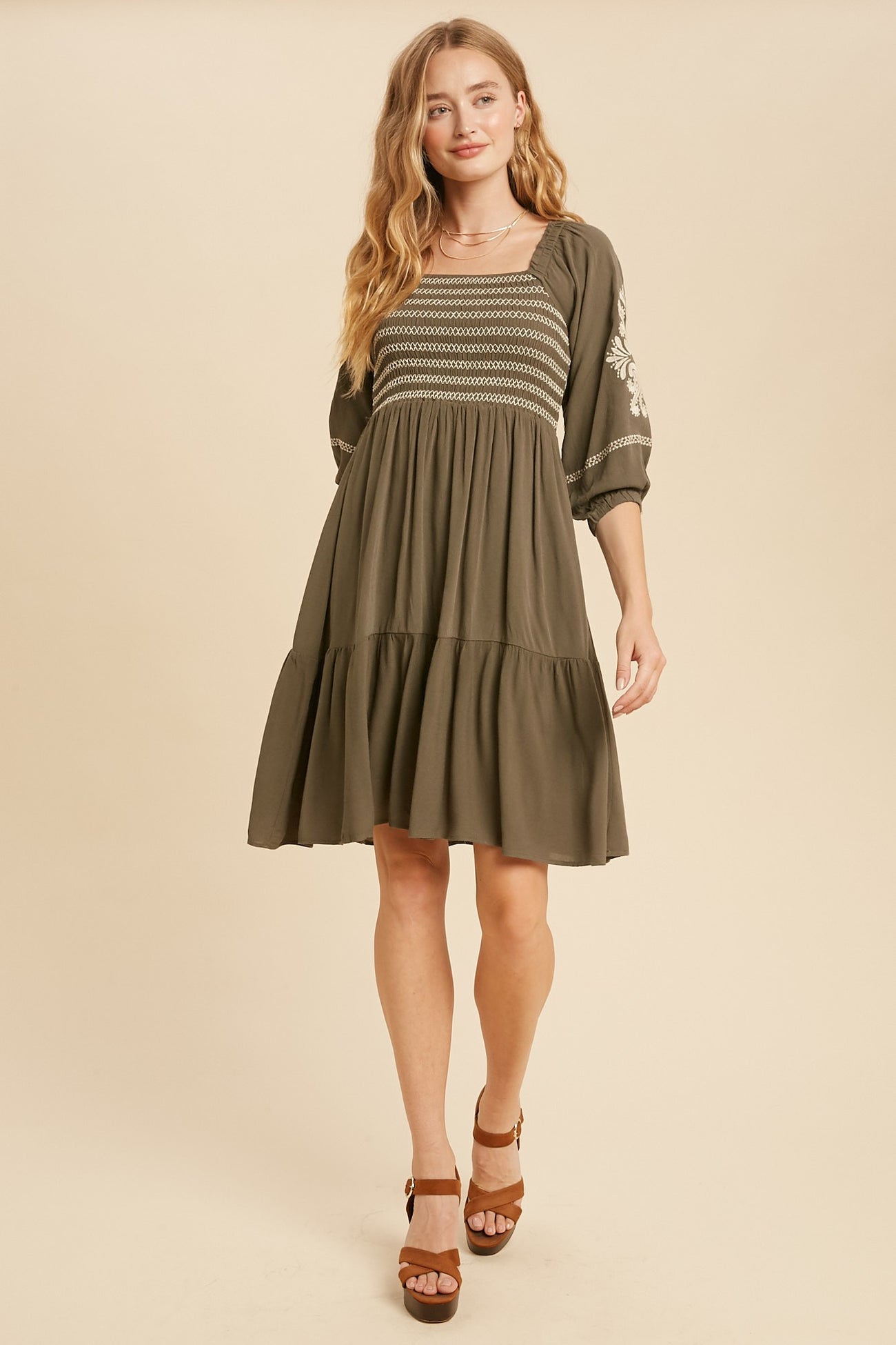 Olive Smocked Embroidered Damask Dress