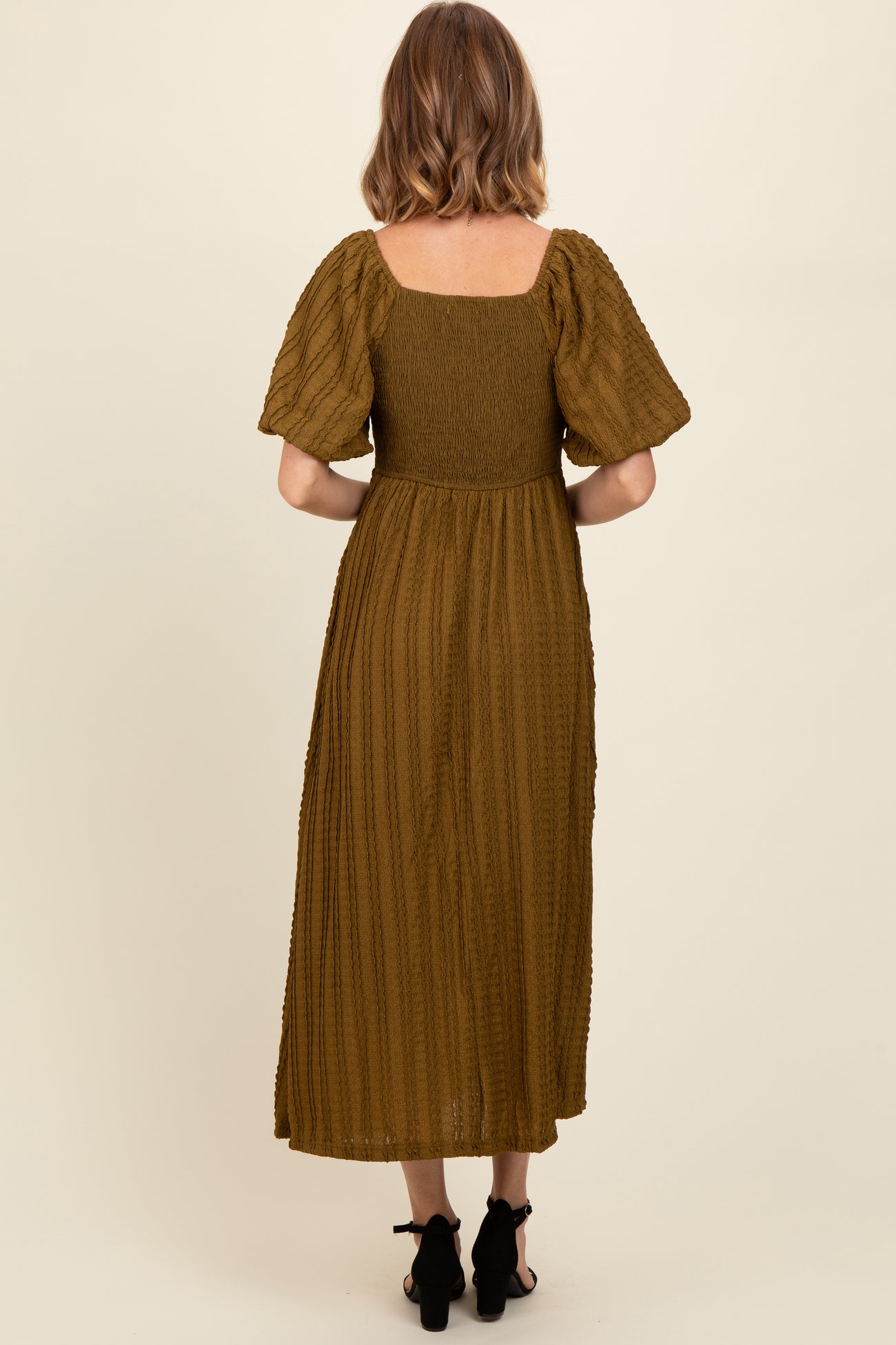 Olive Smocked V-Neck Short Puff Sleeve Textured Midi Dress