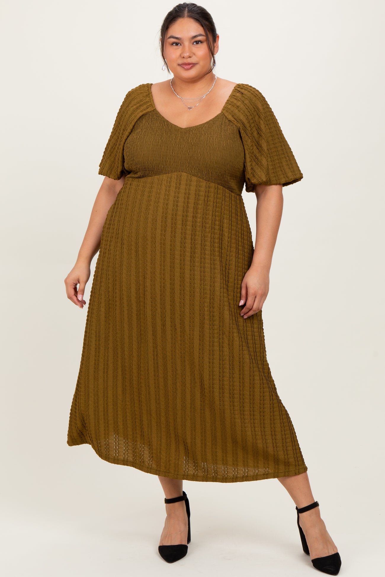 Olive Smocked V-Neck Short Puff Sleeve Textured Plus Midi Dress