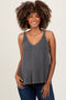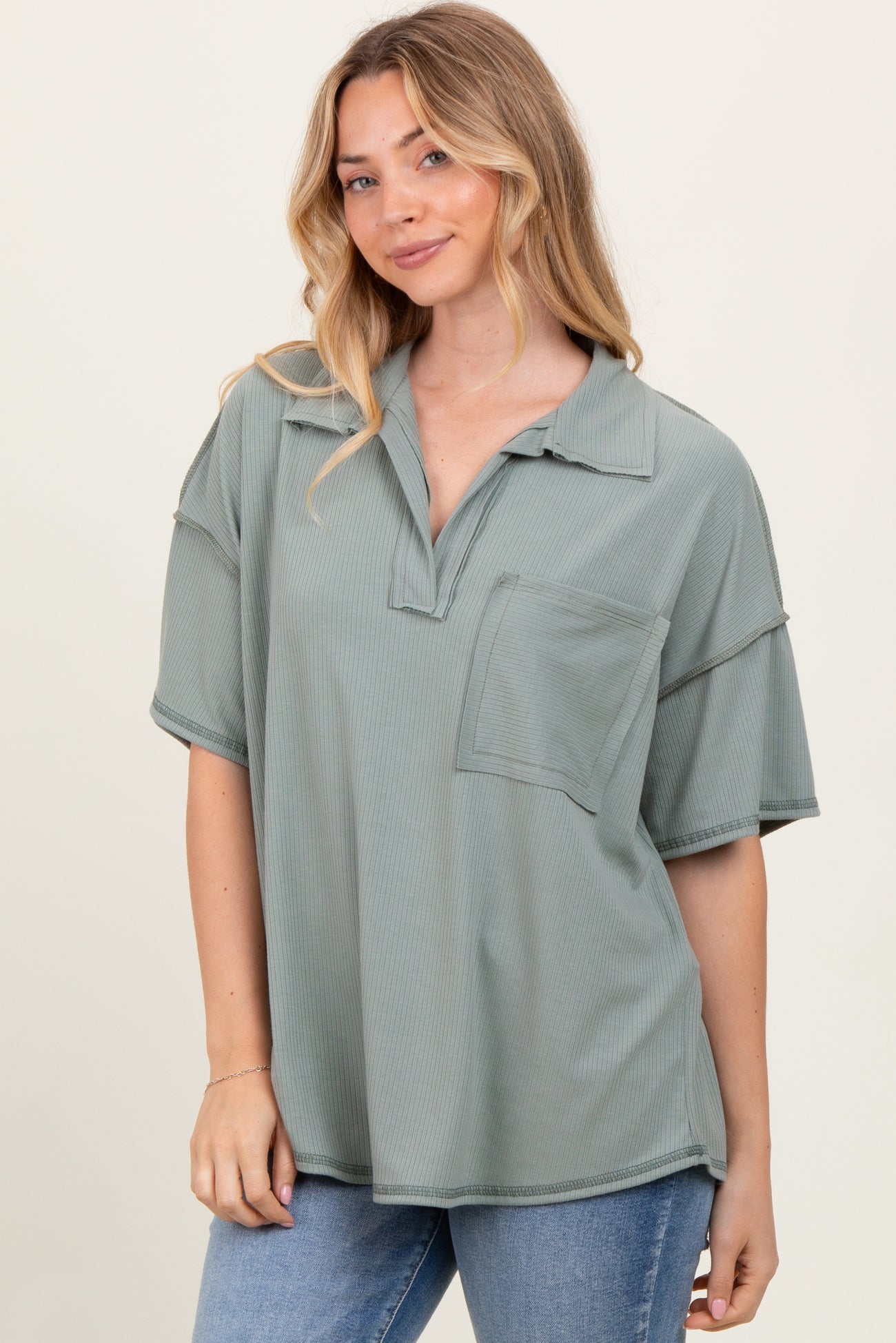 Olive Solid Ribbed Collar V-Neck Tunic Top